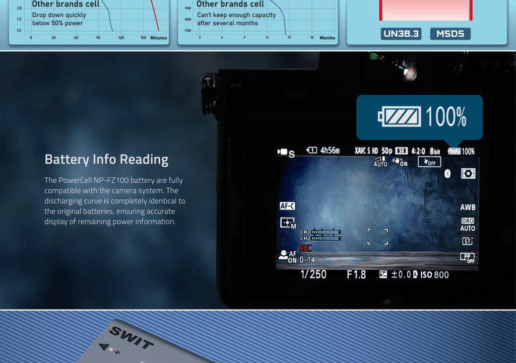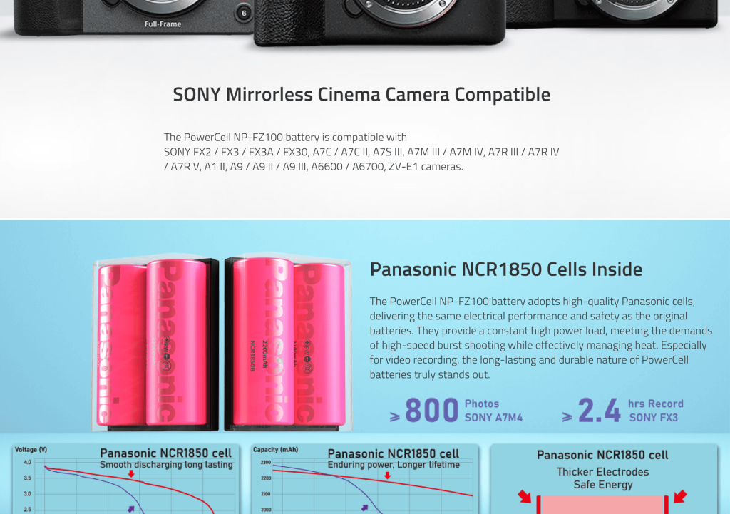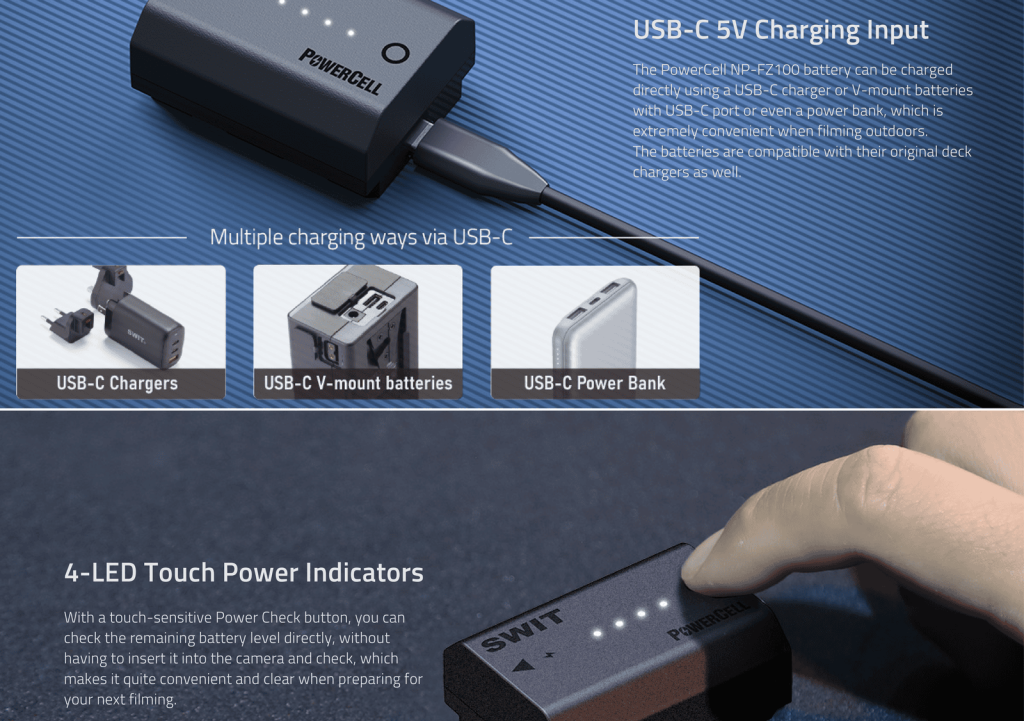PowerCell NP-FZ100 | USB-C NP-FZ100 16Wh DC battery Outlasts the Originals, with Status Indicators, for DSLR/Mirrorless e.g. Sony Fx3/FX30, α7/α9 cameras