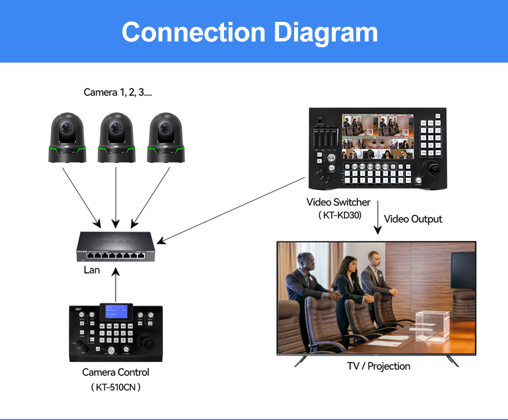 In addition to receiving its own infrared remote control signals, it can also receive signals from user’s infrared remote control and send them to the video conferencing terminal through the VISCA port.