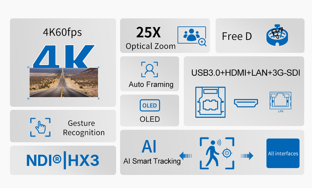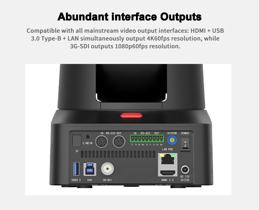 Compatible with all mainstream video output interfaces, HDMI+USB3.0 Type-B+12G-SDI+LAN can simultaneously output 4K60 resolution.