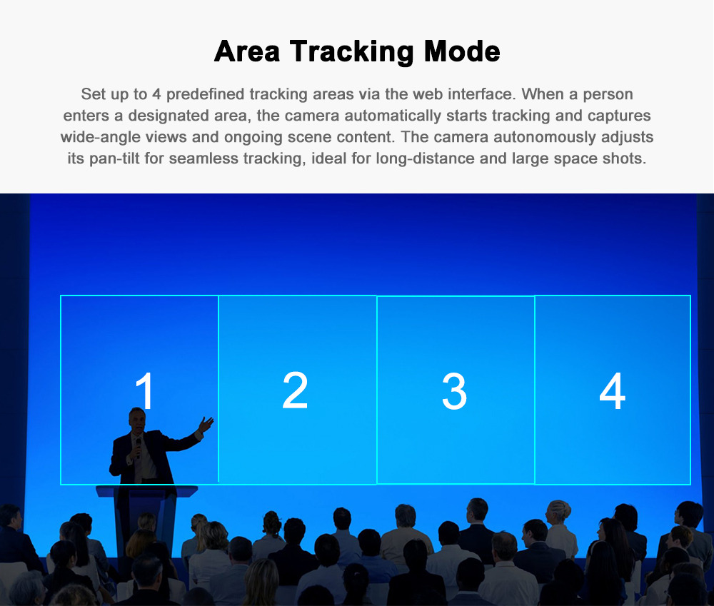 Set up to 4 predefined tracking areas via the web interface. When a person enters a designated area, the camera automatically starts tracking and captures wide-angle views and ongoing scene content. The camera autonomously adjusts its pan-tilt for seamless tracking, ideal for long-distance and large space shots.