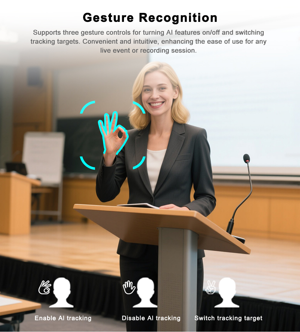 Supports three gesture controls for turning AI features on/off and switching tracking targets. Convenient and intuitive, enhancing the ease of use for any live event or recording session.