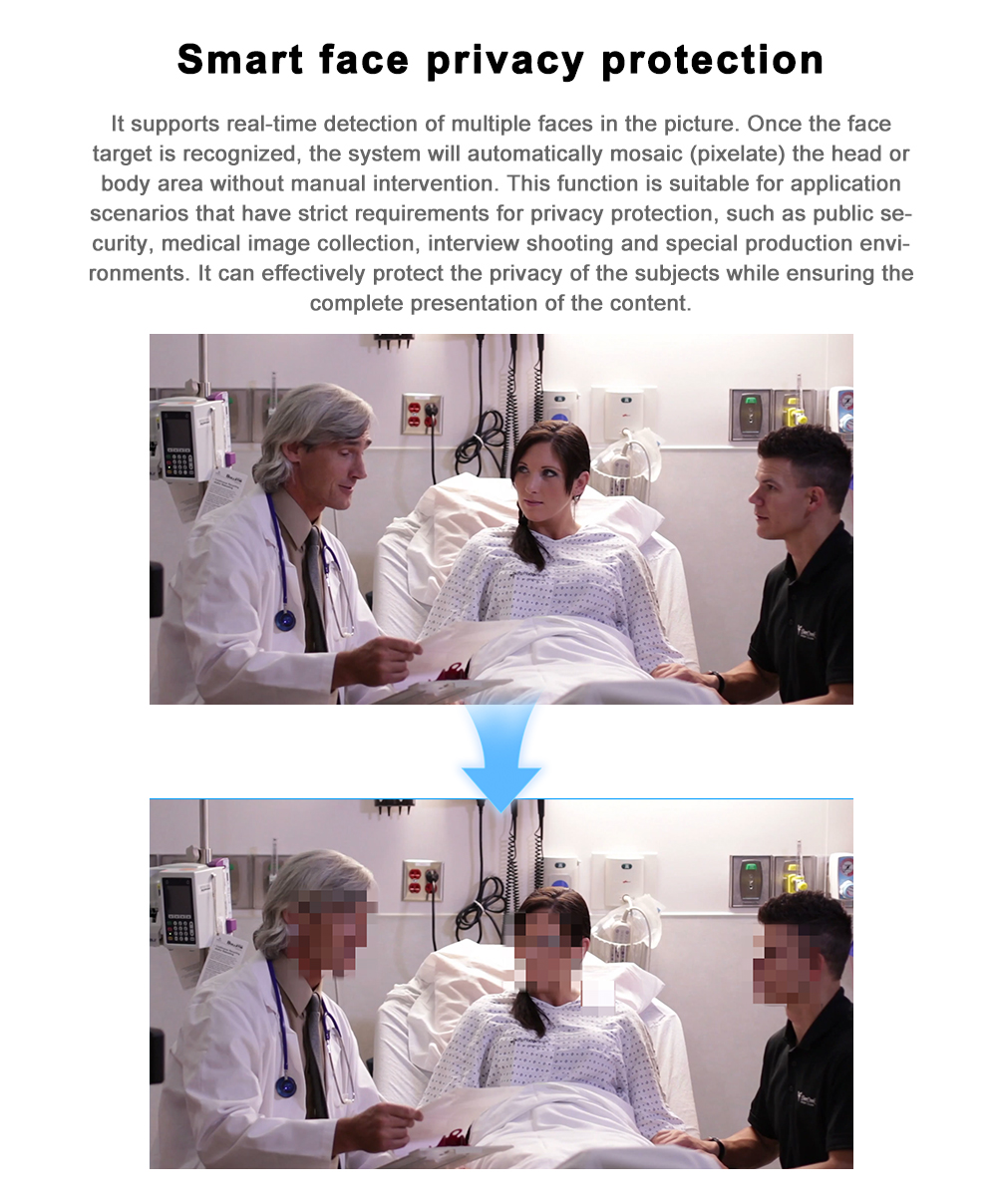 It supports real-time detection of multiple faces in the picture. Once the face target is recognized, the system will automatically mosaic (pixelate) the head or body area without manual intervention. This function is suitable for application scenarios that have strict requirements for privacy protection, such as public security, medical image collection, interview shooting and special production environments. It can effectively protect the privacy of the subjects while ensuring the complete presentation of the content.