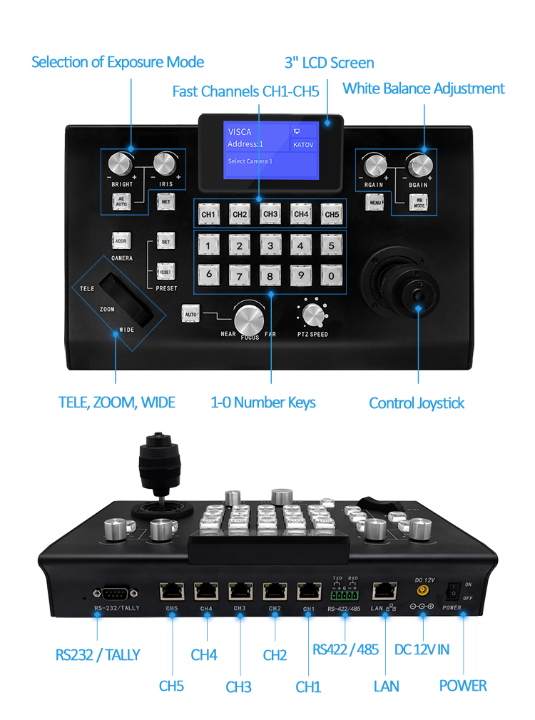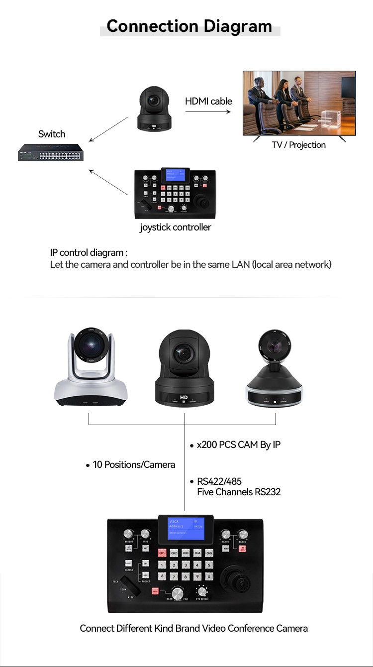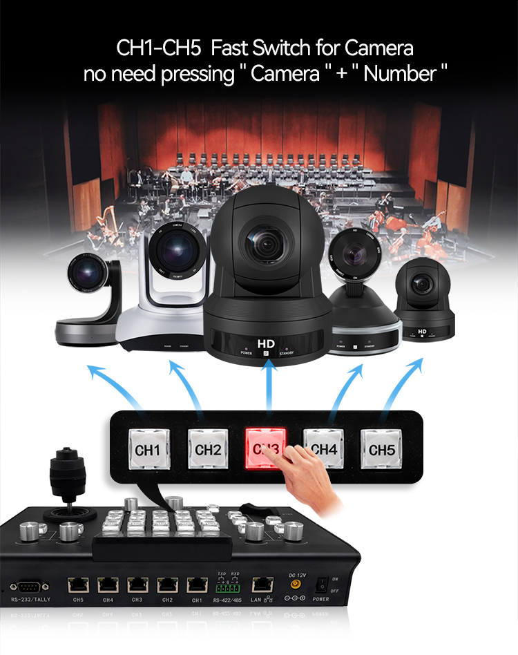 【5 channels RS232, 5 channels IP shortcut, fast camera selection, support multiple connection methods: LAN / RS232 / RS422 / RS485 at the same time】